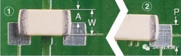 不良:側(cè)面偏出 (A)大于元器件直徑(W)的25%,或焊盤寬度(P)的25%,取兩者中的較小者