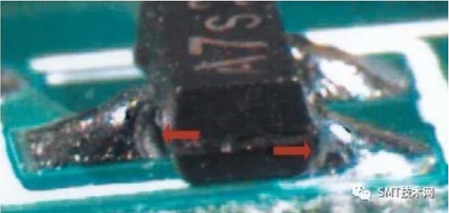 不良:1、散熱面端子的側(cè)面偏出大于端子寬度的25%。2、散熱面端子的末端偏出焊盤。
