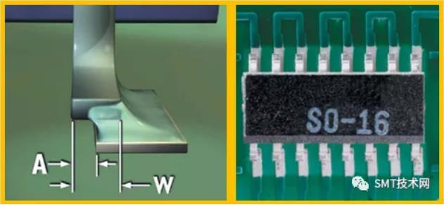 不良:側(cè)面偏出 (A)大于引線寬度(W)的25%或0.5mm[0.02in],取兩者中的較小者