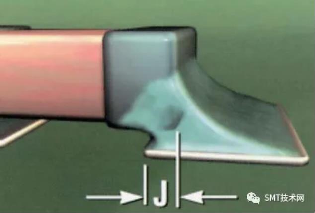 不良:元器件端子與焊盤之間的末端重疊(J)小于元器件端子長度(R)的75%